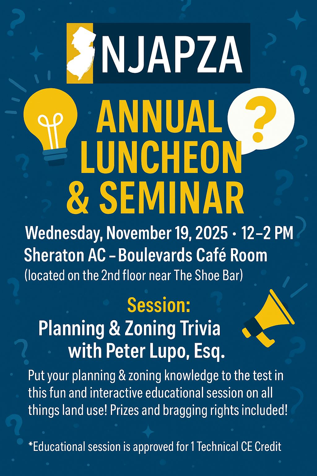 The Annual Luncheon registration is now closed. Please reach out to the NJAPZA Executive Director, Christina Schwartz, directly with any requests for new registrations or to modify any existing registrations by email or by using the Contact Us function on the NJAPZA website.